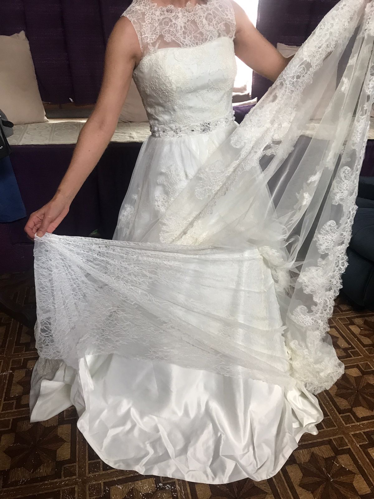 Vestido completamente nuevo, de encaje con 7 capas y pedrería, abotonado toda la espalda y excelente soporte en el busto. Cinta de pedrería en la cintura y Cola de encaje.