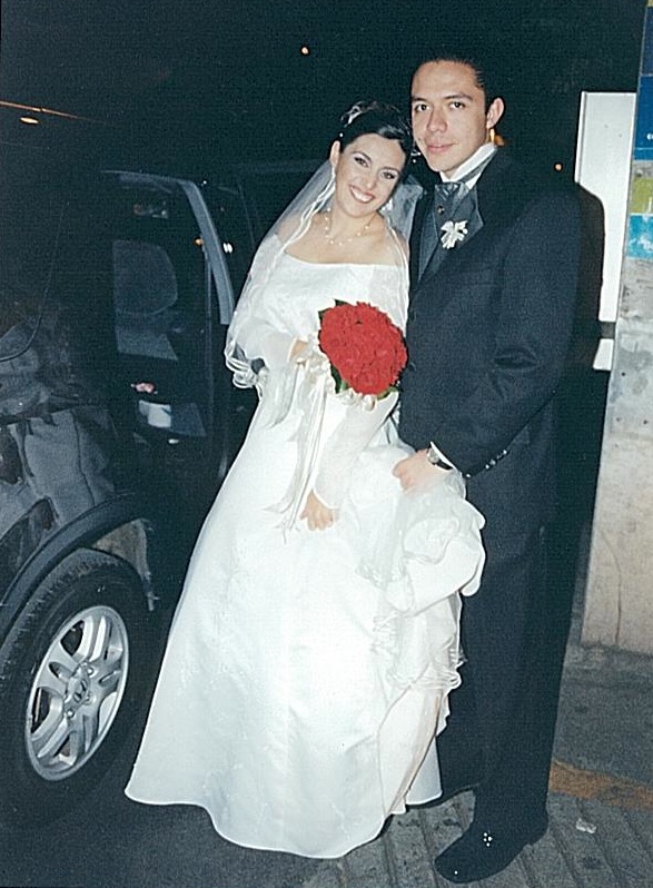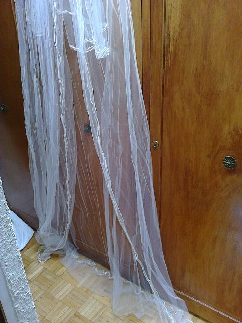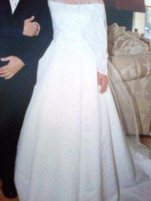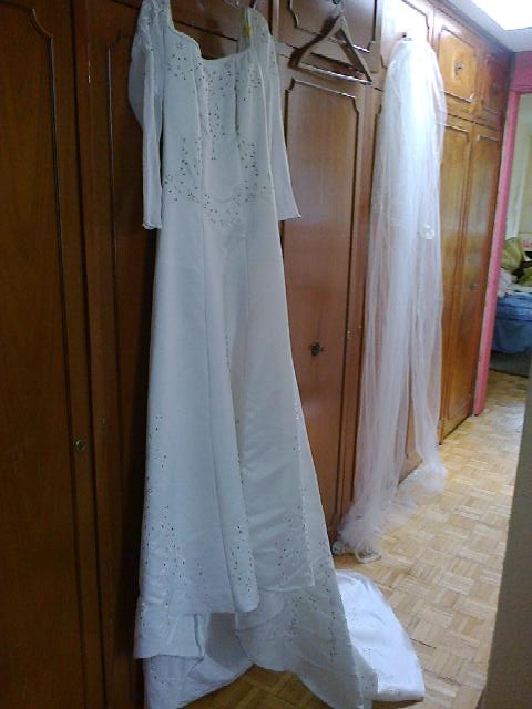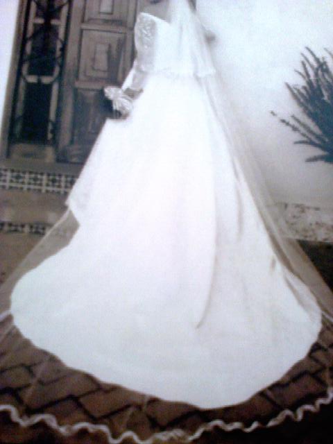 Vestido de Gaza, Tul y Raso con Brocado. Escote en los hombros para mujeres de talla 36-B o C. Tiene su velo de 2.5metros. En color Yvory, no totalmente Blanco pero más claro que el Beige. De manga larga y trasparente de tul.