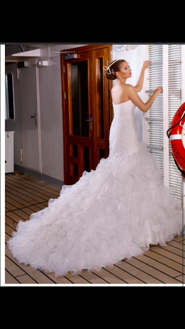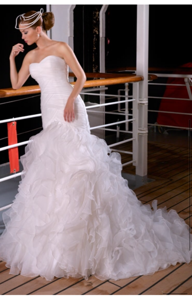 Es blanco de organza, corte de sirena con escote en forma de corazón.