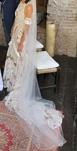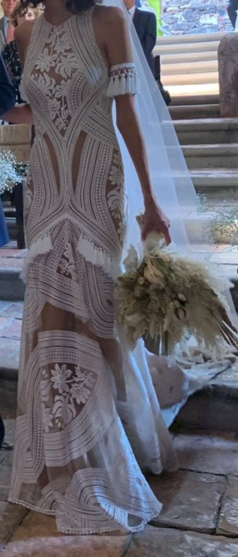 Se vende vestido de novia tipo Boho. Marca: Rue de Seine. Año del modelo: 2021. Talla 0. Tejido a mano en color blanco, gasa color beige. Mangas incluidas.