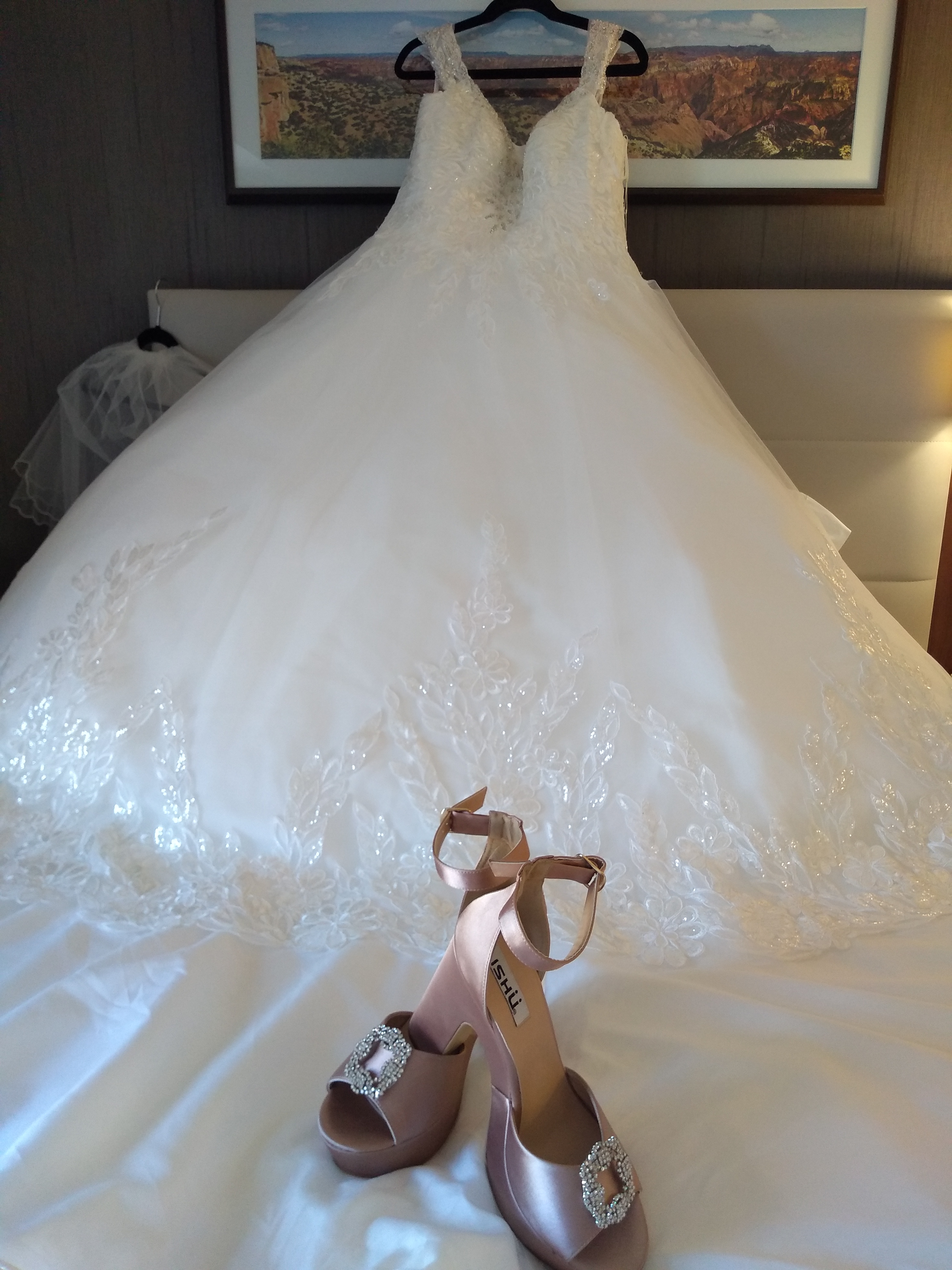 Vestido corte princesa en talla extra xxxl, trae cintillas por lo que puede subir o bajar una talla, todo el corset y la parte de abajo se encuentra con un bordado hermoso inspirado en el lago de los cisnes, trae cauda de 1mt la cual se levanta para la hora del baile, el diseño está creado para modelar el cuerpo y ocultar la pansita, talla de pantalón 15 o 17, blusa xl o xxl, de regalo la bata y pantuflas de novia, costo original $23,000 incluye velo corto, el color se llama white off, esta entre el blanco y el ivory.