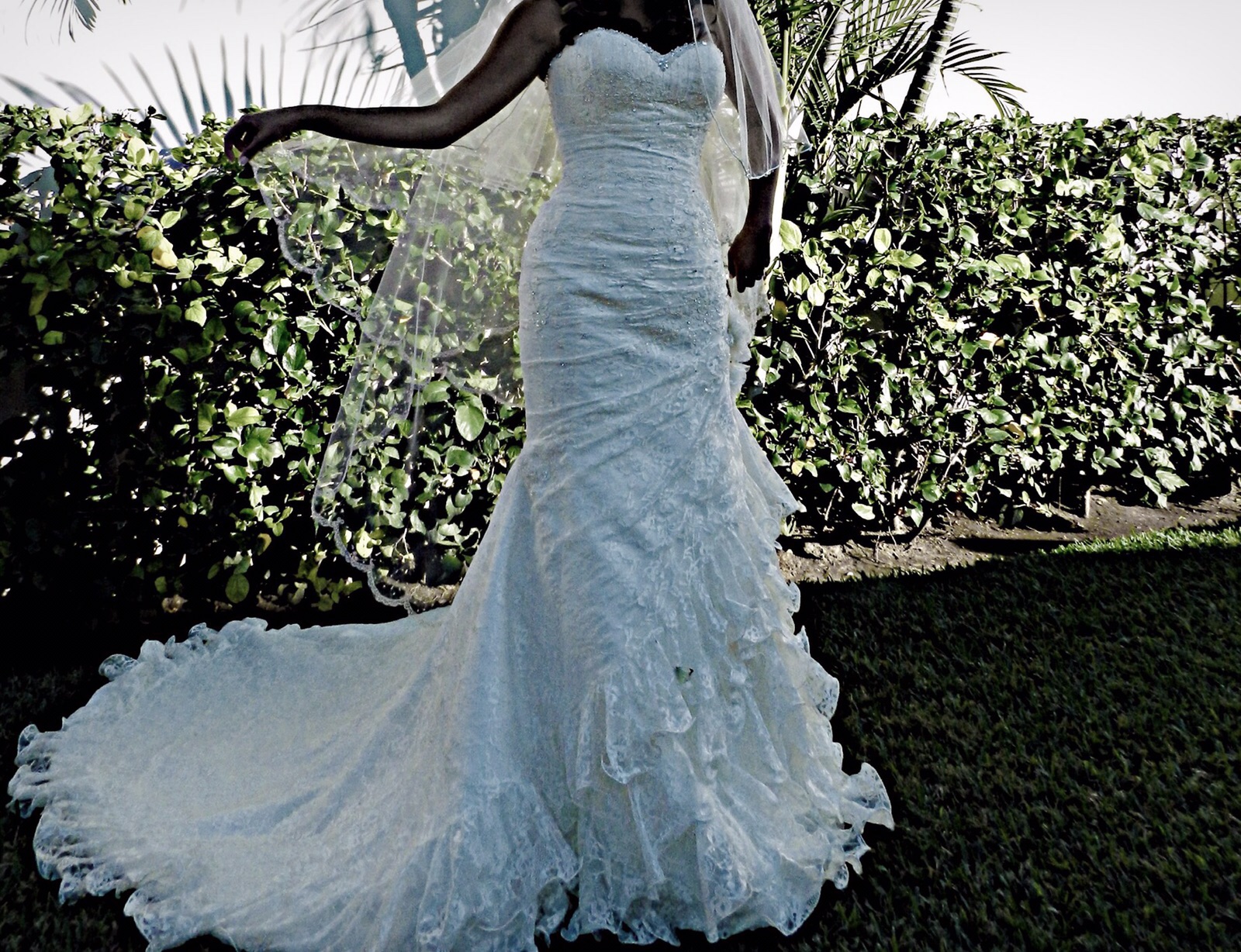 Se hicieron incrustaciones de Swarovski en todo el vestido y en el velo corto que esta incluido.