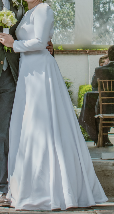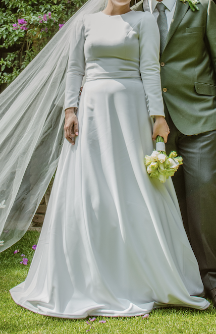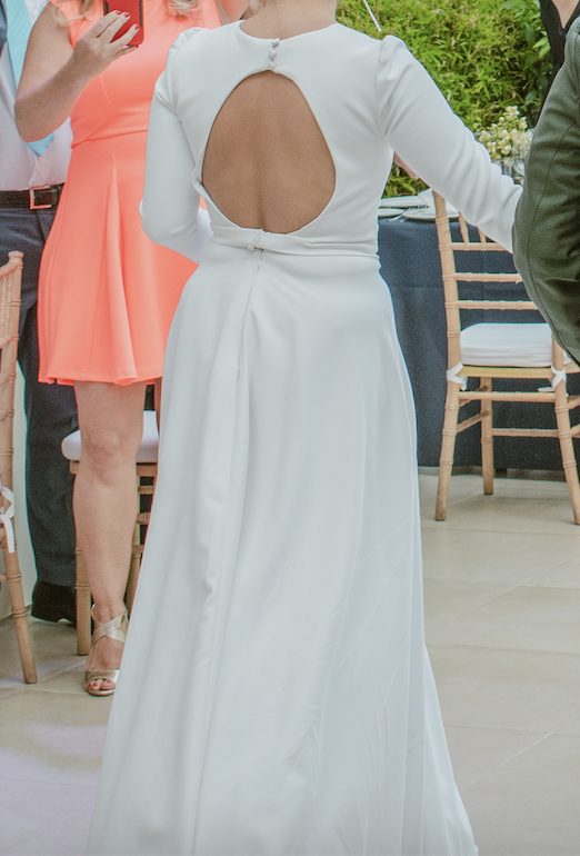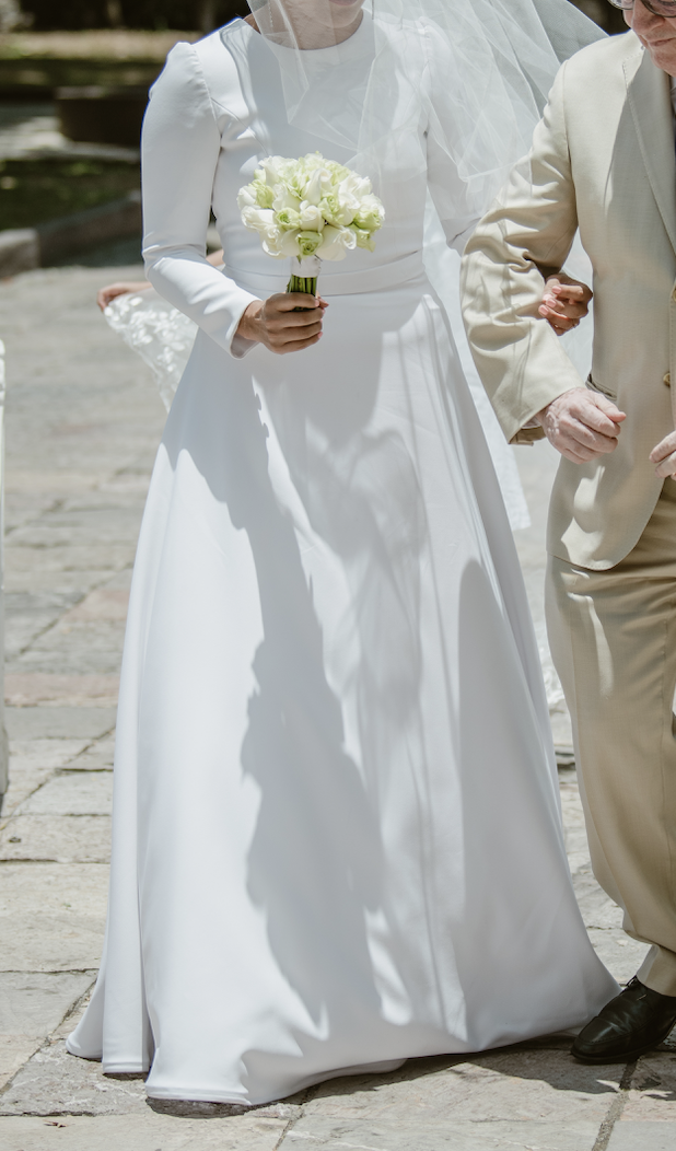 El vestido es cómodo, hecho de tela “Valentino”, un textil diseñado especialmente para no arrugarse; podrás lucir divina en todo momento el día de tu boda sin preocuparte por arrugas. La pieza es del diseñador Victor Rizzo, quien creó este vestido pensando que en que fuera cómodo y único. No tiene varillas ni piezas que se ciñan al cuerpo incómodamente, se compone de tres piezas: vestido, cola y crinolina. La manga larga es idónea para un clima fresco, el escote en la espalda hace un equilibrio único entre un vestido atrevido y conservador. El escote es redondo, no será necesario complementar con más joyas al cuello, bastará con un lindo conjunto de aretes y tocado. El color del vestido es blanco limpio, ideal para pieles que reciben mejor los colores fríos. El tono liso del vestido, lo hace fácil de combinar con la mantilla que elijas y/o joyería de cualquier estilo le queda bien. Ha sido utilizado en una ocasión únicamente y fue creado especialmente para una novia con gusto por lo tradicional con toques actuales; como el bloque de color blanco sin interrupciones. Este vestido es para ti si tienes un ánimo sutil y sencillo; si buscas lucir tú ante todo. La pieza lisa y continua, lleva un cinturón que disimula caderas anchas. La crinolina da cuerpo a una estructura que abre la silueta de forma “A” desde la cintura hacia abajo. La tela es 100% poliéster y recibe bien el planchado por largas horas sin mostrar arrugas. Saca lo mejor de ti con esta pieza, ligera y con un estilo de tipo español elegante.