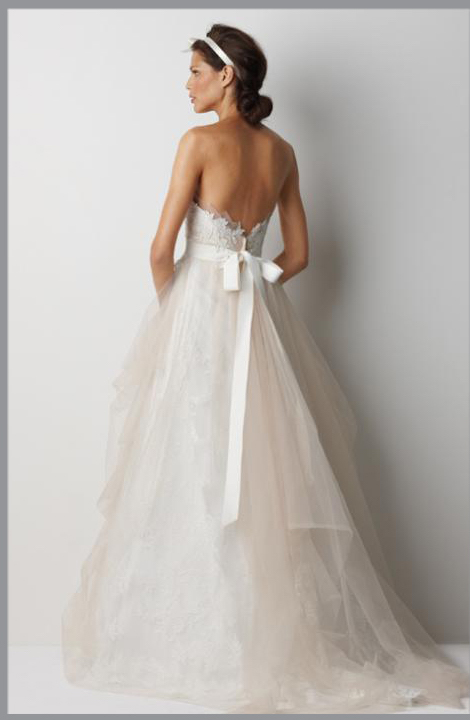 El vestido tiene varios materiales, tiene algo de tul y encaje. El fondo de encaje es blanco y tiene una capa de tul arriba color entre ivory y rosa viejo lo cual le da un tono espectacular a cierta parte del vestido, se puede apreciar algo en la foto donde se ve la parte de atrás. El arreglo fue en la bastilla.